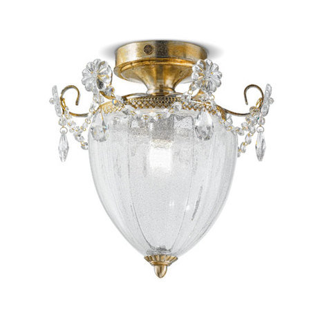 Потолочный светильник серии RUGIADA имеет металлическую основу покрытую фольгированным золотом. Элегантный плафон выполнен из муранского стекла ручной выдувки. Световой элемент один. Светильник декорирован цепочками и подвесками из прозрачного хрусталя.