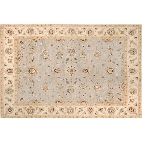 Ковер выполнен как стилизованная классика. Спокойный светло-голубой фоновый цвет ковра великолепно дополняется кантом молочного цвета. Орнамент представлен в виде крупных цветов, симметрично расположенных по всему ковру, и имеющих растушеванные контуры.