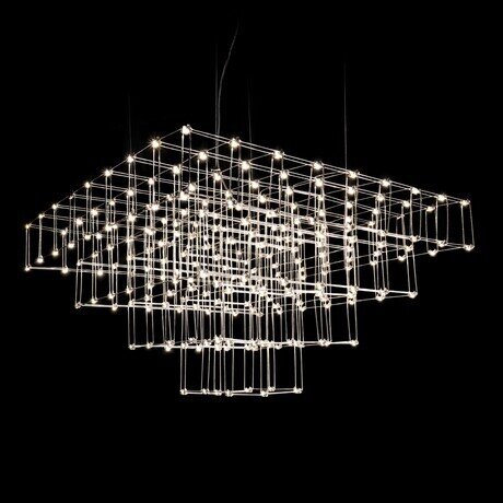 Люстра подвесная Jacqueline хромПодвесная дизайнерская люстра Jacqueline изготавливается в ручную из тонких стальных прутков и светодиодов. Модель выглядит легкой, практически невесомой. Люстра будет прекрасно смотреться в гостиной, спальне, холле, столовой.Светодиоды на пересечениях линий подчеркивают очертания люстры, усиливая воздушность и легкость конструкции.Цоколь:LEDЦветовая температура:3000КДиммирование:нетКоличество светодиодов:240Световой поток, lm:14400Мощность, вт:120Степень защиты:IP20Крепление:Потолочная площадка; Цанговый подвесДлина тросов:150 см