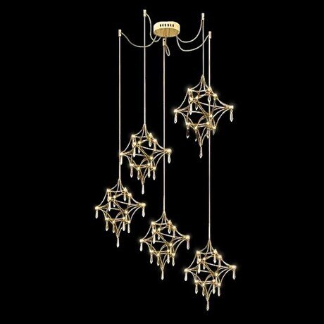 Люстра Mariah 5 золотоИзысканный подвесной светильник ручной работы из пяти стилизованных «плафонов» удачно дополнит обстановку гостиной, столовой, холла, спальни. Изящное сочетание кружевного металлического каркаса, граненых подвесок и ярких огней светодиодов создает приподнятое настроение. Смотрится нарядно и вместе с тем элегантно. Подходит для оформления помещений в неоклассическом стиле, в стилистике ар-деко, модерн, фьюжн, а также интересно сморится в минималистичном окружении, создавая яркий акцент. В люстре Mariah 5 используется каркас из тонких прутков нержавеющей стали. РЦоколь:LEDЦветовая температура:3000КДиммирование:нетКоличество светодиодов:60Световой поток, lm:3600Мощность, вт:30Степень защиты:IP20Крепление:Потолочная площадка; Цанговый подвесДлина тросов:150 см