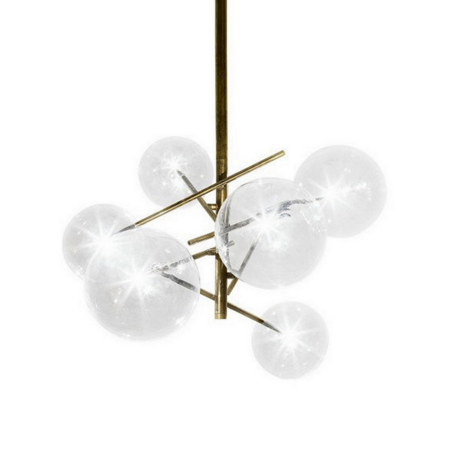 Шикарная люстра Bolle 6Люстра Bolle 6 – оригинальное творение великого мастера света. Она была высоко оценена во время выставки дизайнерских светильников не только профессионалами, но и почитателями таланта художника. Его неповторимый стиль и оригинальность мышления позволили создать уникальную коллекцию, которая стала очень популярной во всем мире.Мастер использовал старинные знания итальянских стеклодувов и инновационные технологии современности.Модель представляет три пары прозрачных плафонов круглой формы, которые изготавливаются вручную. Свет от галогеновой лампы, которая заключена внутри на декоративном латунном стержне.Основой люстры является каркас из латунных стержней, на которые закреплены светящиеся шары разного диаметра. Конструкция подвешена к потолку и находится на металлическом основании.Металл прошел обработку искусственного старения – это пятна, небольшие вмятины, легкая патина. Рисунок всегда эксклюзивный, повторить который невозможно. Это придает дополнительную ценность светильнику.Длина штанги регулируется, что дает возможность использовать для различных по площади помещений.Люстра прекрасно будет сочетаться со стилем Арт-Деко и Модерн в гостиной, кухне. Станет украшением и ярким источником света в уютном кафе, модном ресторане, отеле.Цоколь:G4;LEDКоличество плафонов:6Форма плафона:ШарВысота:65 смДиаметр:55 смКоличество ламп:6Источник освещения:В комплект не входитСтиль:Арт-Деко;МодернМесто применения:HoReCa;Гостиная;Кухня;Лофт;Отель;Прихожая;Спальня;Столовая