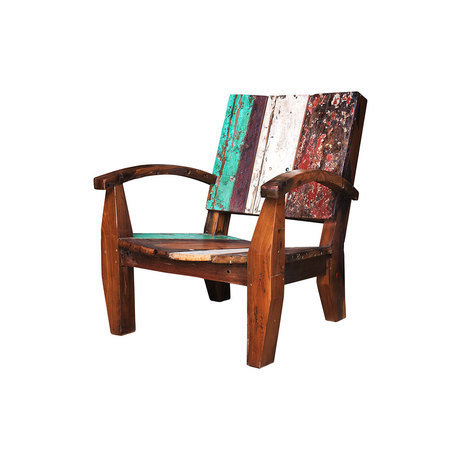 Кресло, выполненное из массива древесины старого рыбацкого судна, такой как: тик, махагон, суар, с сохранением оригинальной многослойной окраски.